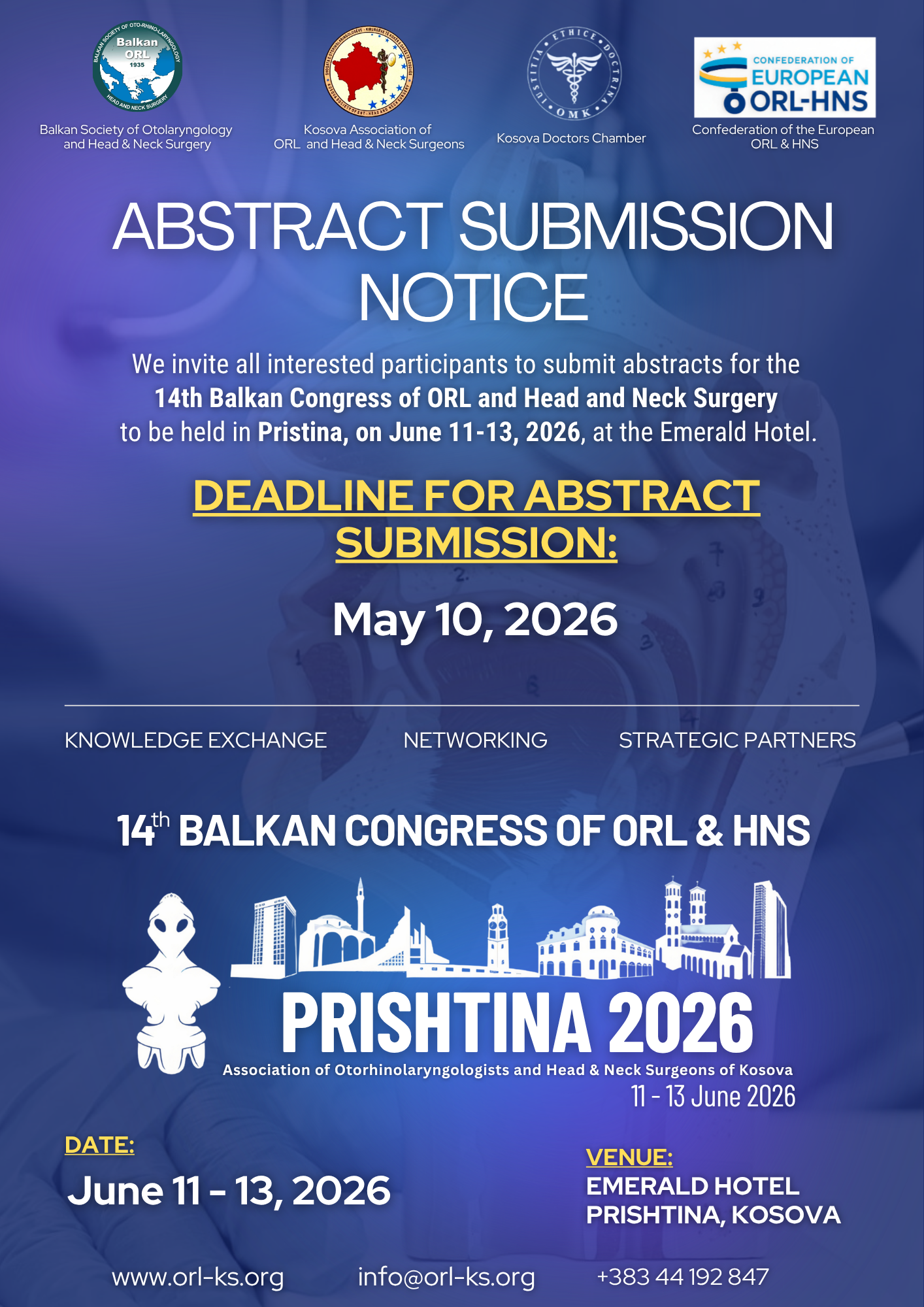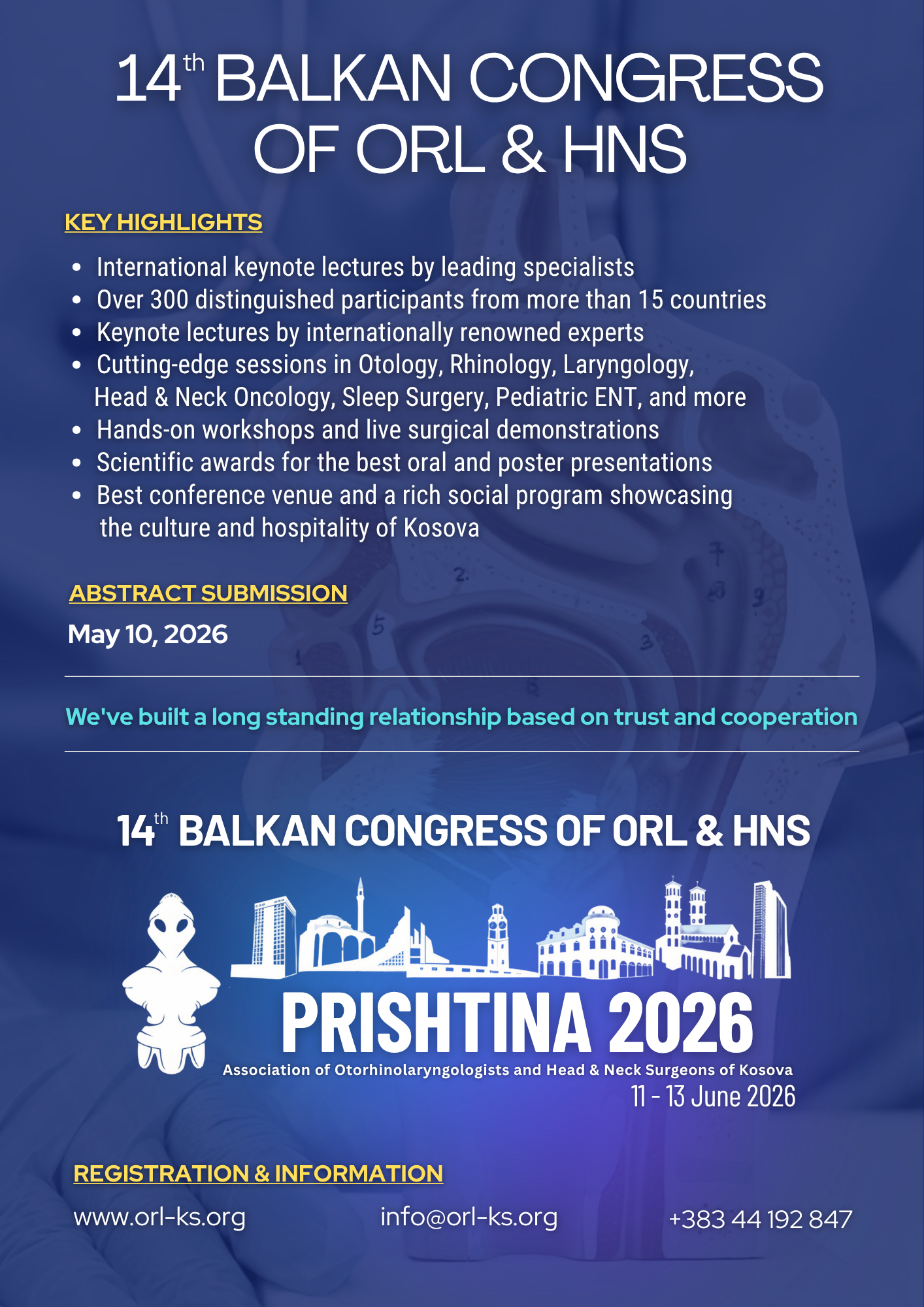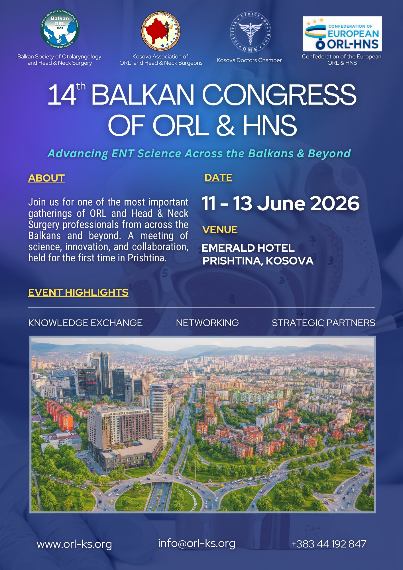 We've built a long standing relationship based on trust and cooperation. This congress is coorganized by the Kosova Association of ORL and Head & Neck Surgeons, Kosova Doctors Chamber, Confederation of the European ORL & HNS, and in cooperation with the Balkan Society of Otolaryngology and Head & Neck Surgery.